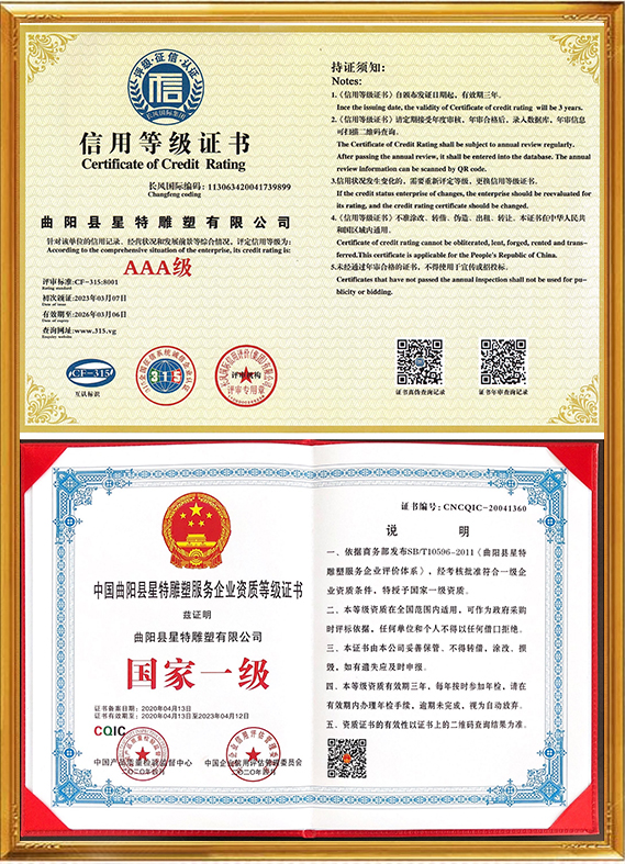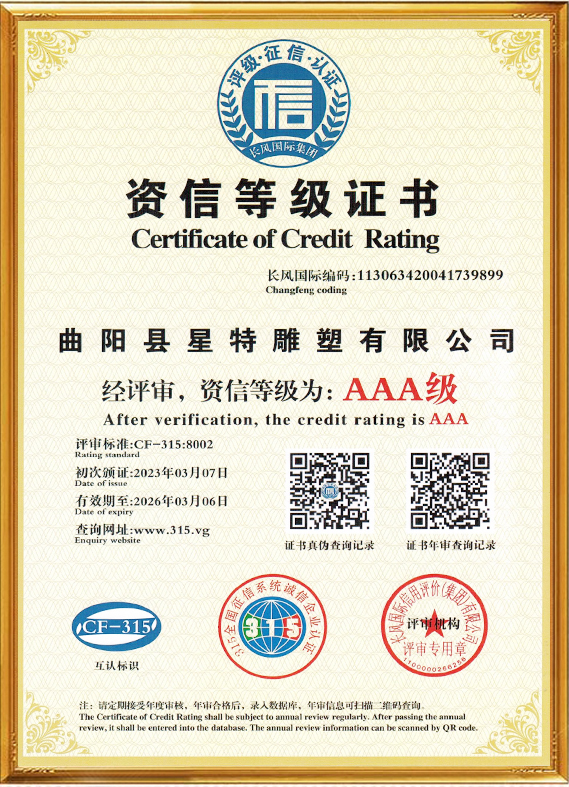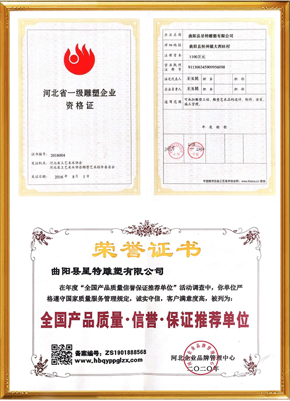 曲陽縣星特雕塑有限公司成立于2008年,總部位于具有千年雕刻文脈、擁有“中國雕刻之鄉”美譽的河北省曲陽縣,是一家集創意設計、雕塑生產、雕塑藝術創作、景觀環境藝術為一體的雕塑公司。在十幾年的時間里,我們從蹣跚起步,再到砥礪前行,始終持初心、踐匠行,為弘揚曲陽雕塑文化做出自己應做的貢獻。目前,我公司與中央美術學院、清華大學美術學院、西安美術學院等全國知名美院機構保持長期的交流與學習,并與多個國家雕塑、美學專家老師合作、溝通、共享雕塑帶來的無國界藝術享受。成功設計并制作了數百個城市雕塑作品,受到了當地政府、主管領導及客戶的表彰和贊譽。公司已通過(ISO9001)國家質量體系認證,將繼續秉承誠信、自律、求智、進取的企業精神,和崇尚榮譽、捍衛責任、創造價值的企業核心價值觀,弘揚中華藝術,振興民族產業,發展星特企業,用事實說話,用作品見證,力爭打造一個生命力強勁的民族雕塑企業向著國際化現代企業集團邁進,為曲陽雕塑文化的發揚做出重要貢獻。